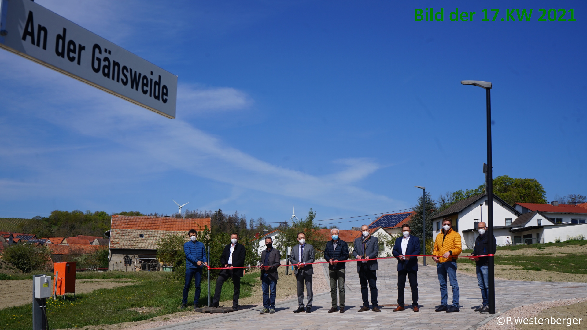 Nach nur 10-monatiger Bauzeit konnte am 27. April 2021 das Neubaugebiet "An der Gänsweide" durch den Erschließungsträger MVV Regioplan Mannheim an die Ortsgemeinde übergeben werden. Auf Grund der immer noch herrschenden Pandemie fand die Übergabe im kleinsten Rahmen statt. Mitarbeiter der MVV, der Verbandsgemeinde, der Fa. Wust sowie Ortsbürgermeister Hans Philipp Schmitt und der 1. Beigeordnete Matthias Martin gaben mit dem obligatorischen Durchschneiden des roten Bandes das Baugebiet frei. Wenn die Coronalage es zuläßt, soll im zweiten Halbjahr ein Dorffest zur Einweihung des NBG nachgeholt werden. Hierüber wird dann zeitnah eingeladen. Hans Philipp Schmitt Ortsbürgermeister