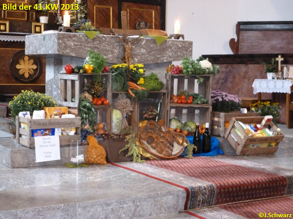 29.09.2013: Erntedankfest in der kath. Kirche: Wie in den vergangenen Jahren auch, wurden wieder haltbare Lebensmittel für die Alzeyer Tafel gesammelt. Insgesamt kamen 4 Kisten voll Spenden zusammen und zusätzlich noch 150,00 Euro, von denen dann vor Ort Lebensmittel gekauft werden. Allen Spendern auch auf diesem Wege ein herzliches Dankeschön!