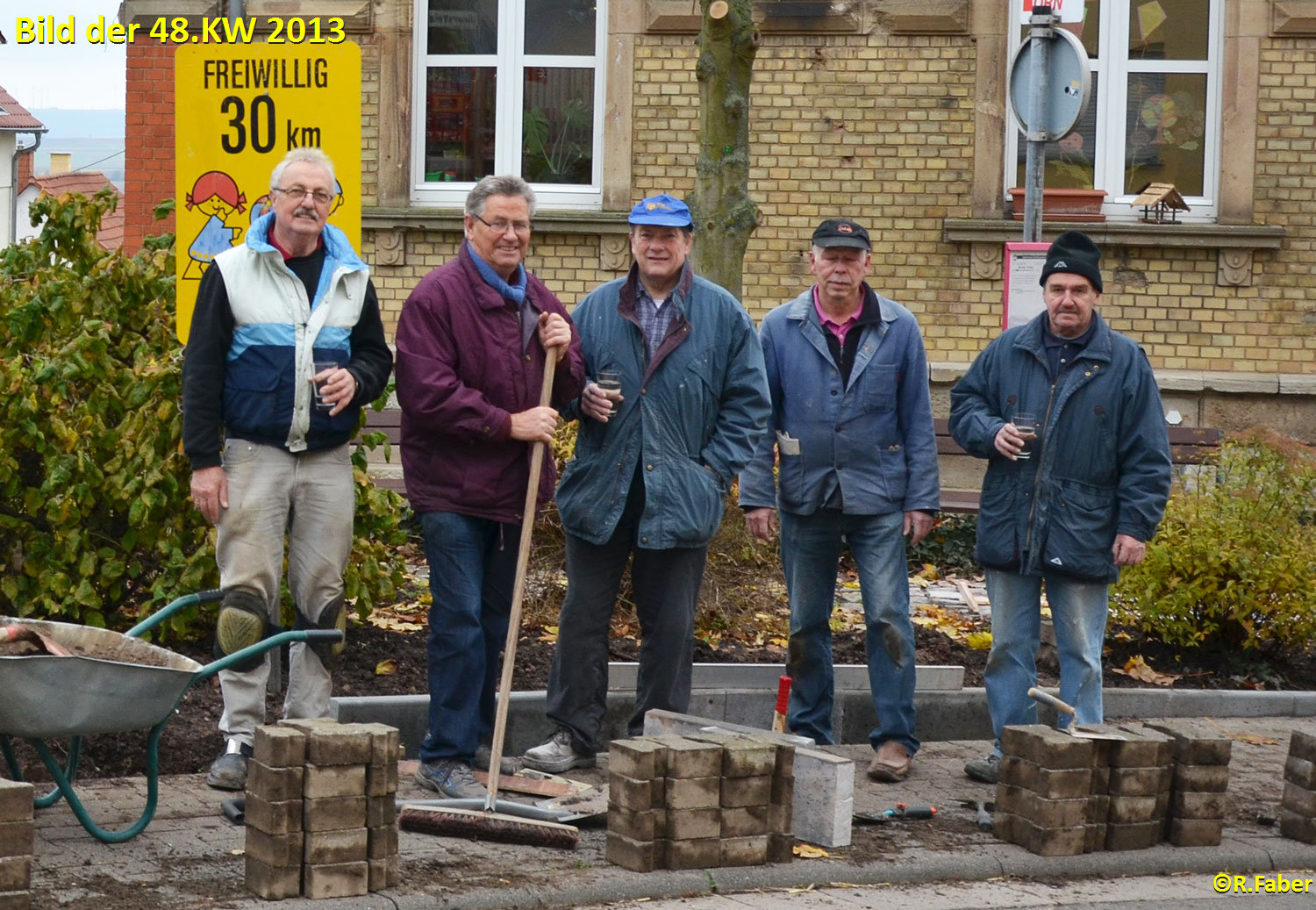 22.11.2013: Die „Zappewichtel“ (Spiesheimer Rentner) haben letzten und diesen Freitag als erstes Projekt die Randsteine am Kindergarten gesetzt.
