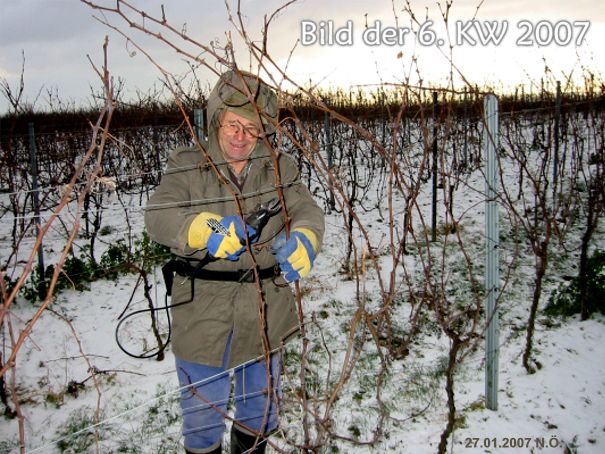 Ob es stürmt oder schneit ist ganz egal, die Reben müssen geschnitten werden, wenn im Herbst wieder geerntet werden soll. Eine Elektroschere erleichtert Adalbert Jung die Arbeit.