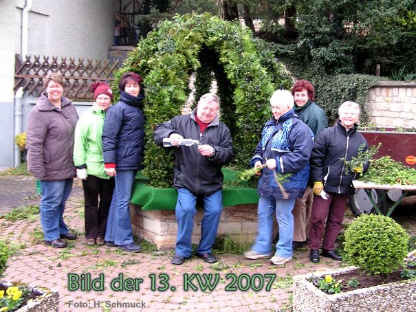 Der "harte Kern" der Landfrauen und ein Landmann, trotzen der Kälte und dem eisigen Wind und schmücken den Oberbrunnen wieder zu einem schönen Osterbrunnen.