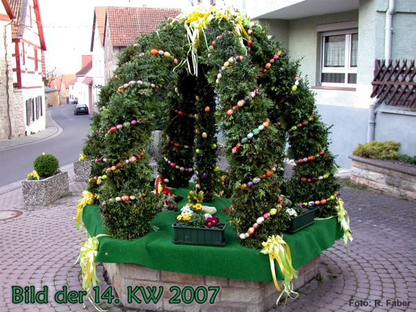 Trotz Schnee und Eiseskälte beim schmücken des "Osterbrunnens" zauberten die Landfrauen und ein Landmann wieder eine schöne Osterkrone auf den Oberbrunnen.