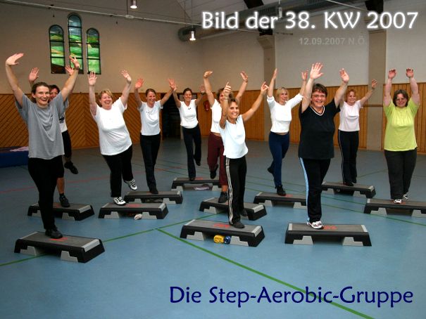 Mit fetziger Musik bringen sich die Step-Aerobic-Damen jeden Mittwoch von 19.00-20.00 Uhr ganz gehörig ins Schwitzen. Und alle haben ihren Spaß dabei.