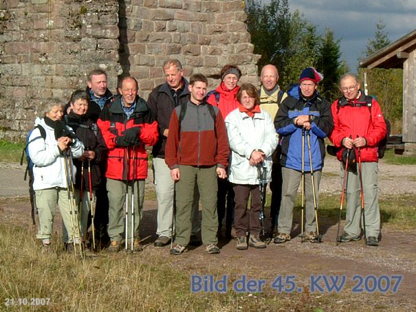 Gruppenbild der Wanderer vor dem Kaiser-Wilhelm-Turm auf dem Hohloh im Nordschwarzwald, während der Wanderung vom Kaltenbronn, vorbei am Wildsee mitten im Hochmoor, zurück nach Reichental zur Unterkunft.