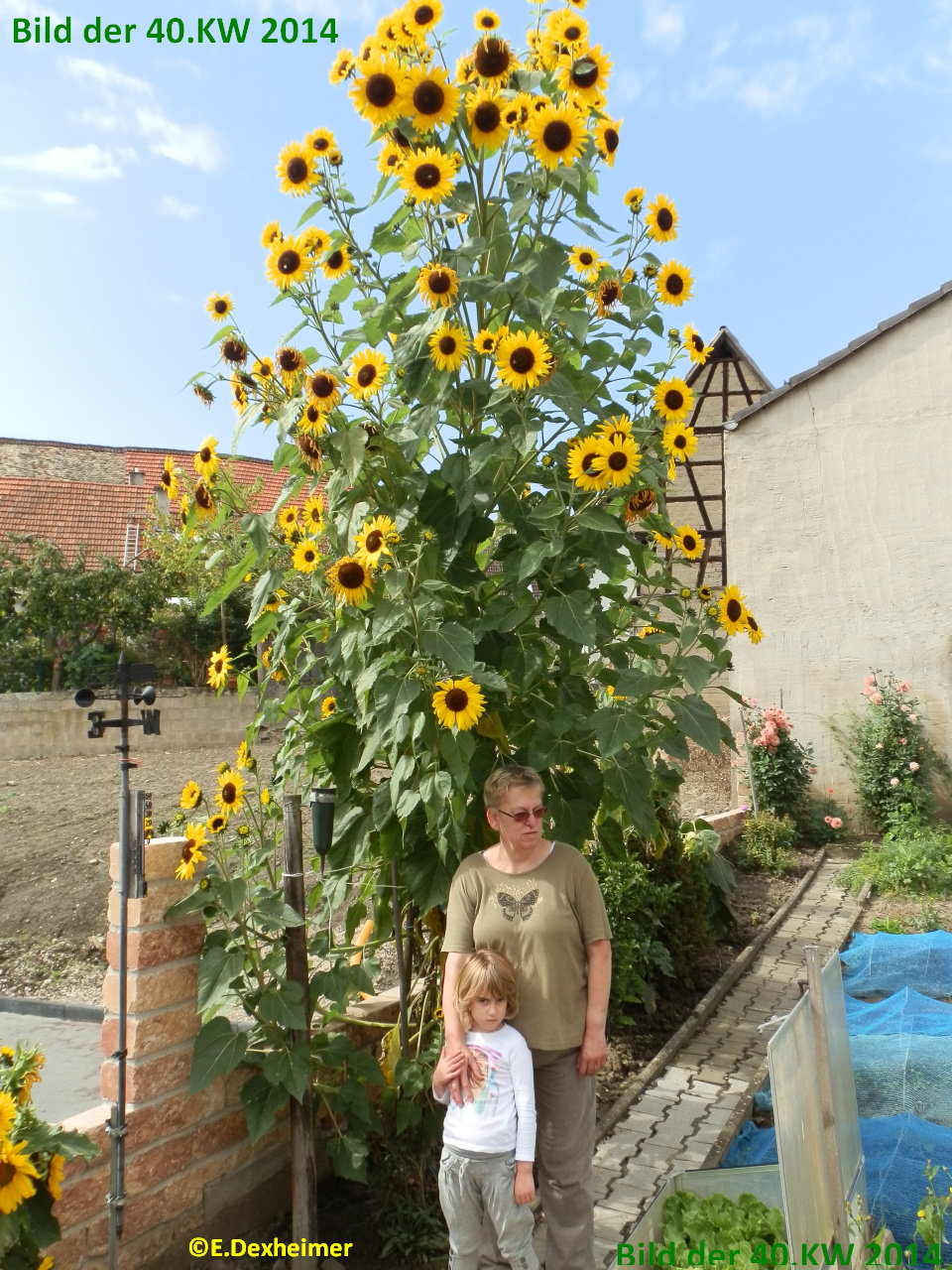 Elenore Andre ist stolz auf die am höchsten gewachsenen Sonnenblumen in Spiesheim, ein Resultat der regelmäßigen Pflege durch Vater Willi Andre dem wir auf diesem Wege gute Besserung wünschen.