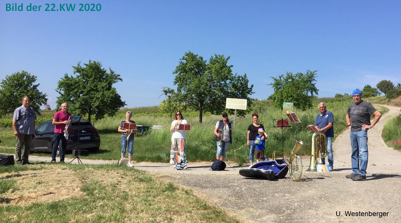 Musikalische Klänge des Spiesheimer Posaunenchores über den Dächern von Spiesheim. Anlässlich der Himmelfahrtswanderung "Zwischen den Zeilen" durch die ev. Kirche, spielte der ev. Posaunenchor Spiesheim in den Weinbergen. Da momentan keine Gottesdienste stattfinden hört man seit Ostern, immer sonntags, eine kleine Liedauswahl des Chores in und um Spiesheim.