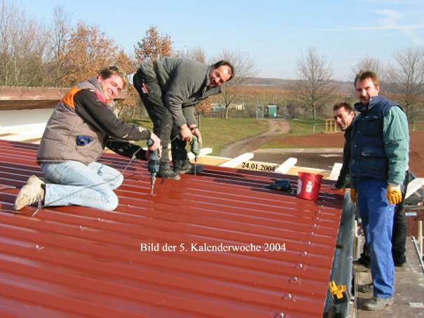 Auch Temperaturen knapp unter 0°C können die fleißigen Helfer nicht von ihrem Vorhaben, das Dach vor dem Sportlerheim einzudecken, abhalten. Viel frische Luft und ein "Dankeschön" des 1. Vorsitzenden der SG Spiesheim genügen Ihnen, sich immer wieder zu engagieren.