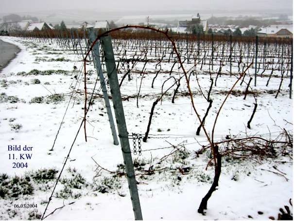 Passend zu dieser originell gebogenen Rebe und dem Schnee am 06.03.2004, eine alte Bauernregel: "Wenn am Fridolinstag (6.3.) Schnee fällt, schneit es noch mindestens 40 Tage bis zum Lenz".