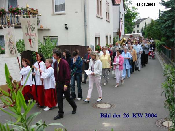 Am 13.06.04 fand die Fronleichnams-Prozession in Spiesheim statt. Mit Begleitung der kath. Kirchenmusik von Armsheim pilgerten die Gläubigen vom Ehrenmal durch den Ort zur Kirche.
