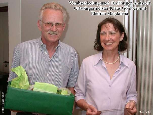 Der erste Beigeordnete Walter Jung verabschiedete Bürgermeister Klaus Gombert nach 10jähriger Amtsführung. Er überreichte ihm und seiner Ehefrau Magdalena ein Blumengesteck und Spiesheimer Wein. Verabschiedet wurden auch die Gemeinderatsmitglieder Agnes Nöth, Horst Schmitt und Reiner Faber.