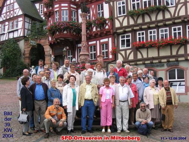 SPD-Ortsverein auf großer Fahrt nach Mainfranken. Am 11. u. 12. September fand der 2-tägige Ausflug nach Amorbach und Miltenberg statt. Das Gruppenfoto entstand auf dem historischen Marktplatz in Miltenberg, genannt "Schnatterloch".
