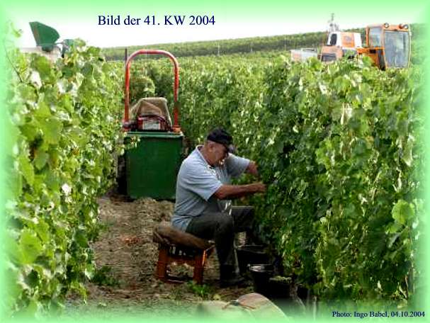 Kaum noch zu finden: Traubenlese per Hand. Im Weinberg nebenan erntet der Traubenvollernter.