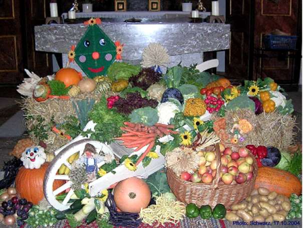 Erntedankgottesdienst in der St. Stephanuskirche am 17.10.2004 Auch in diesem Jahr wurde der Altar mit mancherlei Obst und Gemüse geschmückt. Beim anschließenden Eintopfessen in der Kirche gab es sogar zwei verschiedene Suppen.