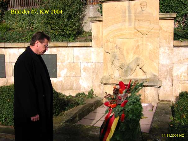 Während der zentralen Gedenkfeier legt Ortsbürgermeister Hans-Philipp Schmitt am Ehrenmal einen Kranz nieder.