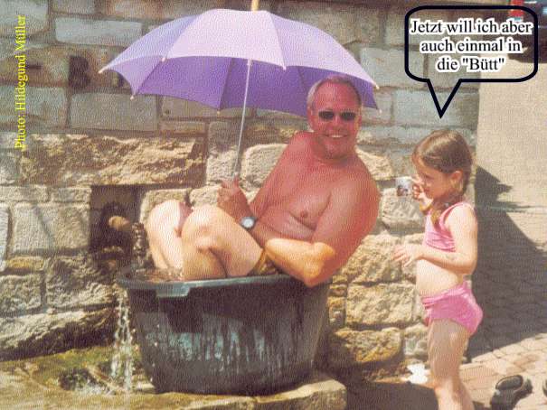 Bei annähernd 40°C im Schatten ist das Gerangel um die wenigen kühlen Plätze am Oberbrunnen groß.