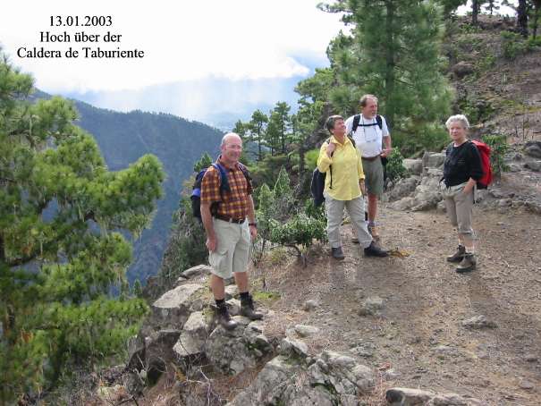 Nach etwa einer Stunde in 1.510m Höhe angekommen hatte man einen grandiosen Blick in die Caldera de Taburiente und den Roque Idafe tief unter sich. Nach einer kurzen Verschnaufpause ging es, immer am Grat entlang, überwiegend bergab. Dabei kam man etwas später sogar an Weinbergen vorbei, in dieser Höhe eher ungewöhnlich. Durch schattigen Kiefernwald, vorbei an Trockensteinmauern voller Hauswurz in allen Größen, erreichte man einige Zeit später den Aussichtspunkt "Torre del Time". Von der Aussichtsplattform hatte man wiederum einen grandiosen Blick tief hinab in den Barranco de las Angustias. Weiter rechts ging der Blick bis hinüber nach El Paso, Los Llanos de Aridane und sogar Puerto de Naos, wo sich das Hotel Sol befindet, konnte man sehen. Nach einer kurzen Mittagspause begab man sich über einen bequemen Fahrweg auf den Rückweg zum Auto. Vorbei an vielen Bananenplantagen machte man noch einen kurzen Abstecher in Puerto de Tazacorte, um sich dann in Richtung Hotel von diesem verträumten Strand zu verabschieden. Für drei Personen aus der Gruppe war dies der letzte Tag und der Rückflug fand am nächsten Tag, dem 14.01.2003, statt.